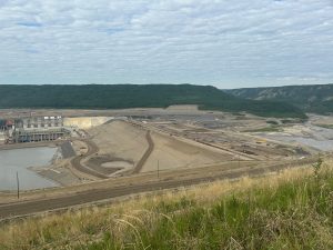 In 2021, placement of material for the earthfill dam began and was completed two years later. About 16 million cubic metres of earthfill material was placed. The dam stands about the height of a 20-storey building and stretches more than one kilometre across the Peace River.
